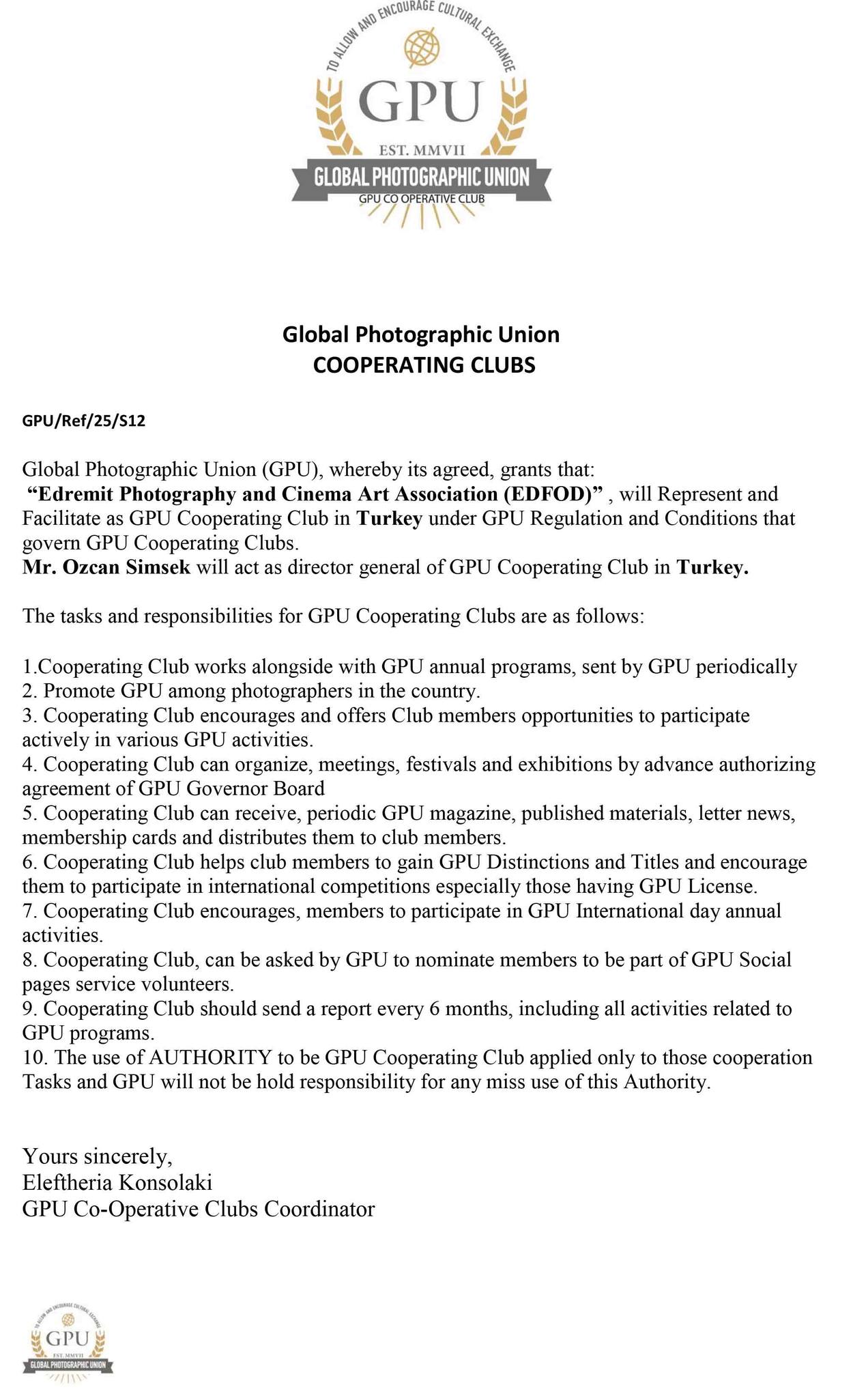 Merkezi Belçika’da bulunan Global Photographic Union (GPU) tarafından, kurucusu ve başkanı olduğum Edremit Fotoğraf ve Sinema Sanatı Derneği (EDFOD) ile Fotogram Photo Club (FPC), GPU Kooperatif Kulüpleri arasına kabul edildi, şahsımı da GPU Kooperatif Kulübü Türkiye Genel Direktörü olarak görevlendirdiler.