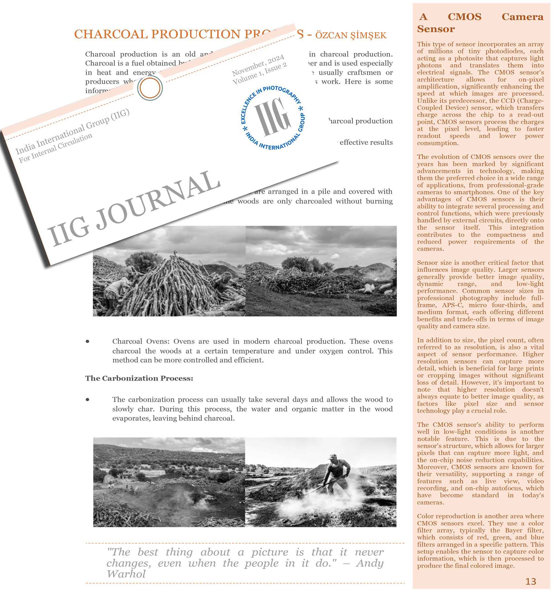 Üyesi olduğum Hindistan Uluslararası Fotoğraf Grubu IIG’nin (India International Group) dergisi ‘IIG Jurnal’in son sayısında yayınlanan “Torakçılar” proje çalışmam ile odun kömürü yapım hikayesini yazdım. Yayınladıkları için IIG’ye teşekkürler.