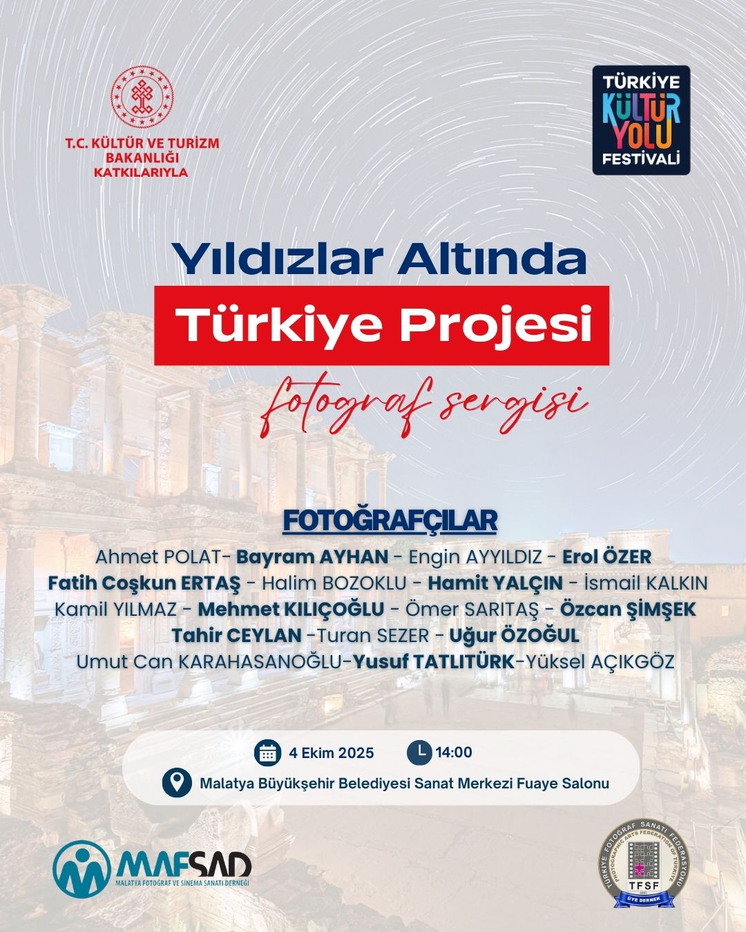 Malatya Fotoğraf ve Sinema Sanatı Derneği (MAFSAD)’nin Kültür ve Turizm Bakanlığının katkıları ve Türkiye Fotoğraf Sanatı Federasyonu ortaklığıyla yürüttüğü ve benim de bir fotoğrafımla yer aldığım “Yıldızlar Altında Türkiye Projesi” fotoğraf sergisi 4 Ekim 2023 saat 14.00’te açılıyor.